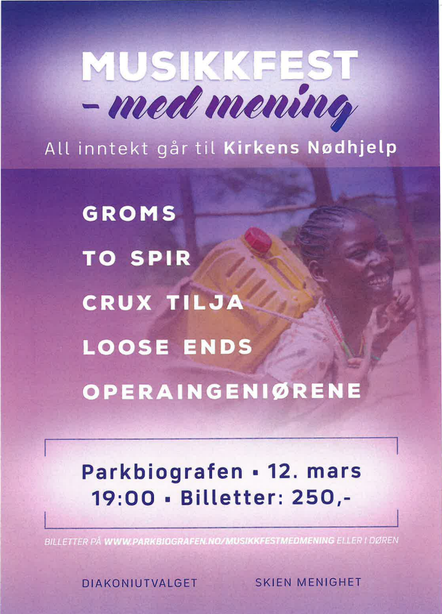 12. mars kl. 19.00 arrangerer Skien menighet ved diakoniutvalget konsert i Parkbiografen. Medvirkende er Groms, To Spir, Crux Tilja, Loose Ends og Operaingeniørene.