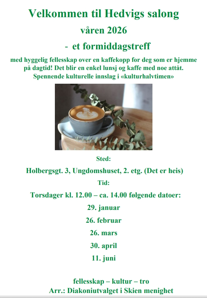 Hedvigs salong er et formiddagstreff for de som er hjemme på dagtid, med enkel servering, et foredrag, prat og fellesskap. Se plakaten under for datoer våren 2026.